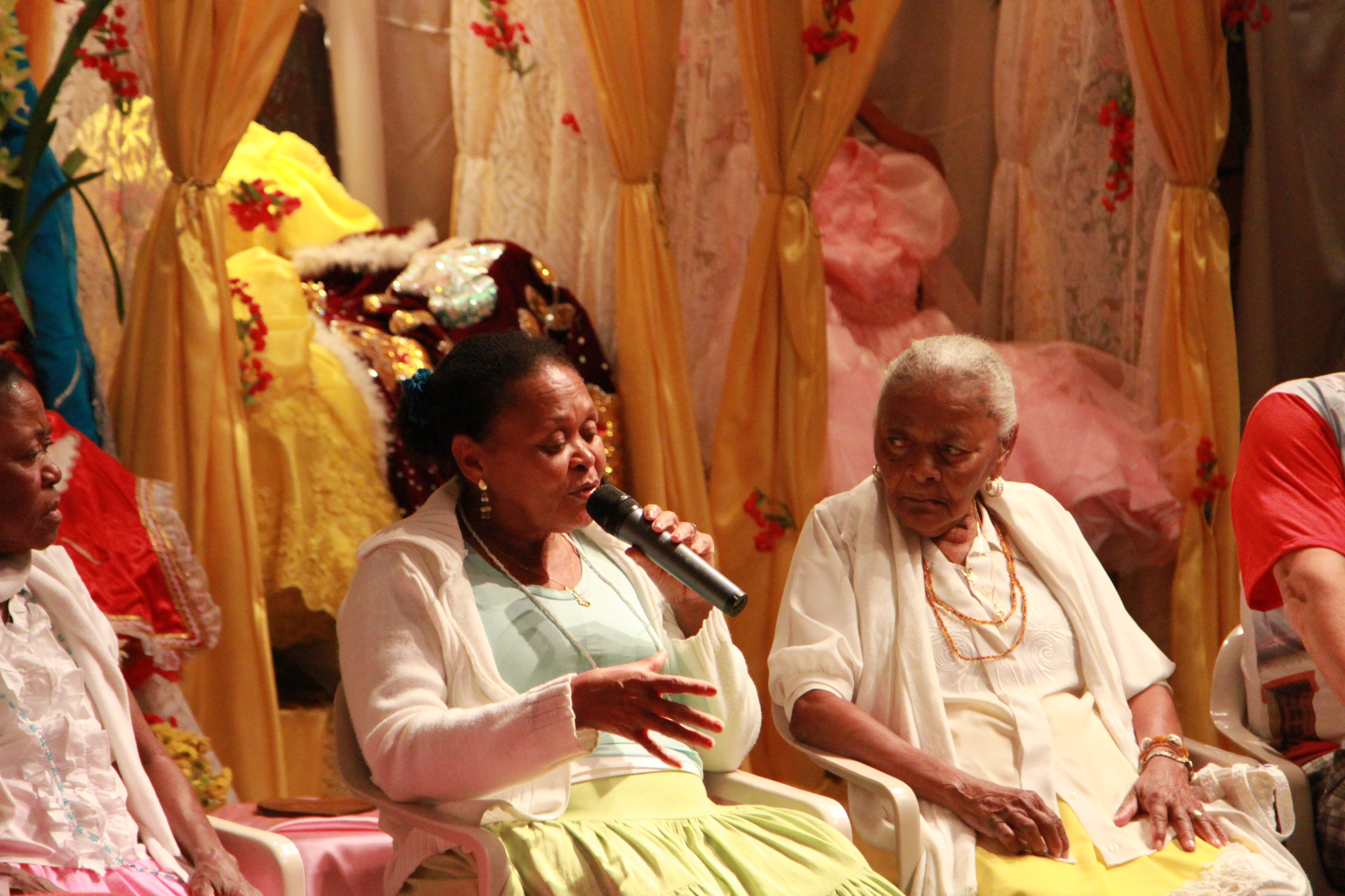 Foto ilustrando um diálogo entre pessoas , onde há duas mulheres negras , a mulher á direita possui um microfone á mão.