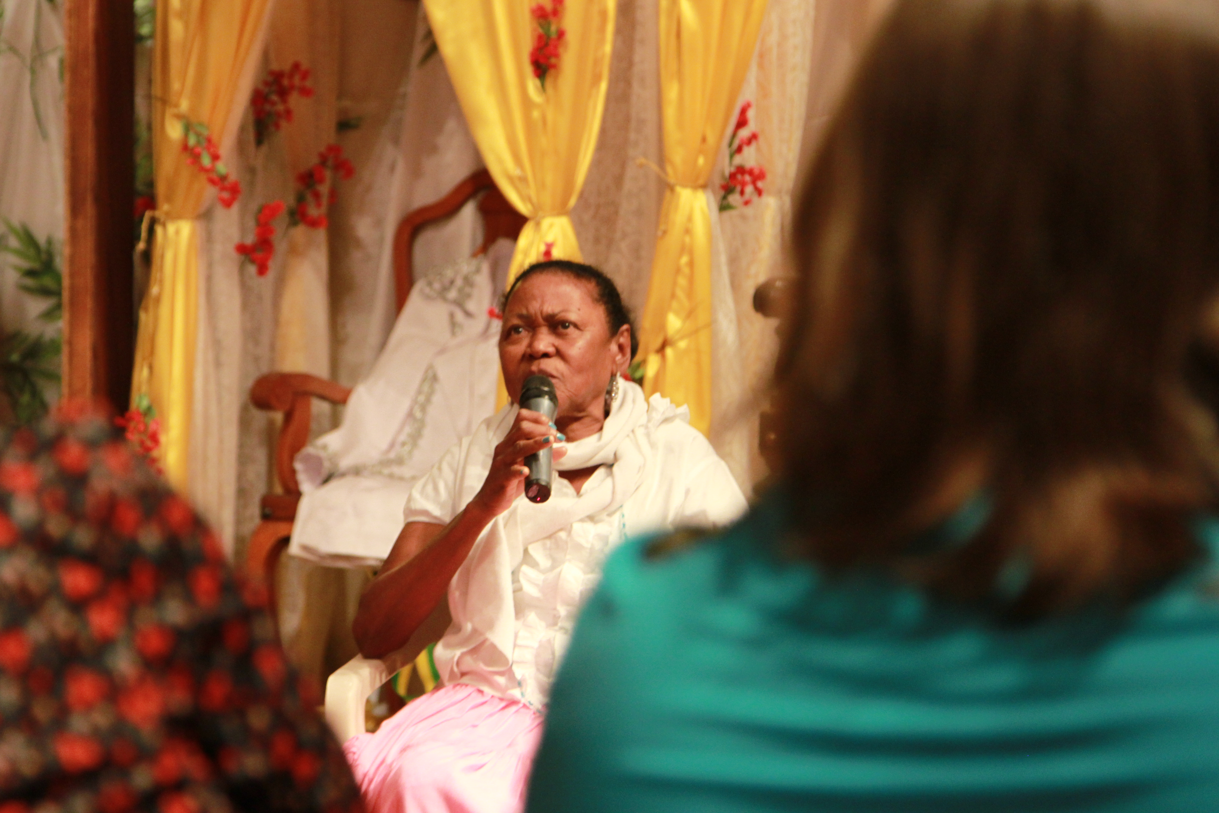 Imagem ilustrando um diálogo onde há uma mulher negra com um microfone falando a um grupo de pessoas.