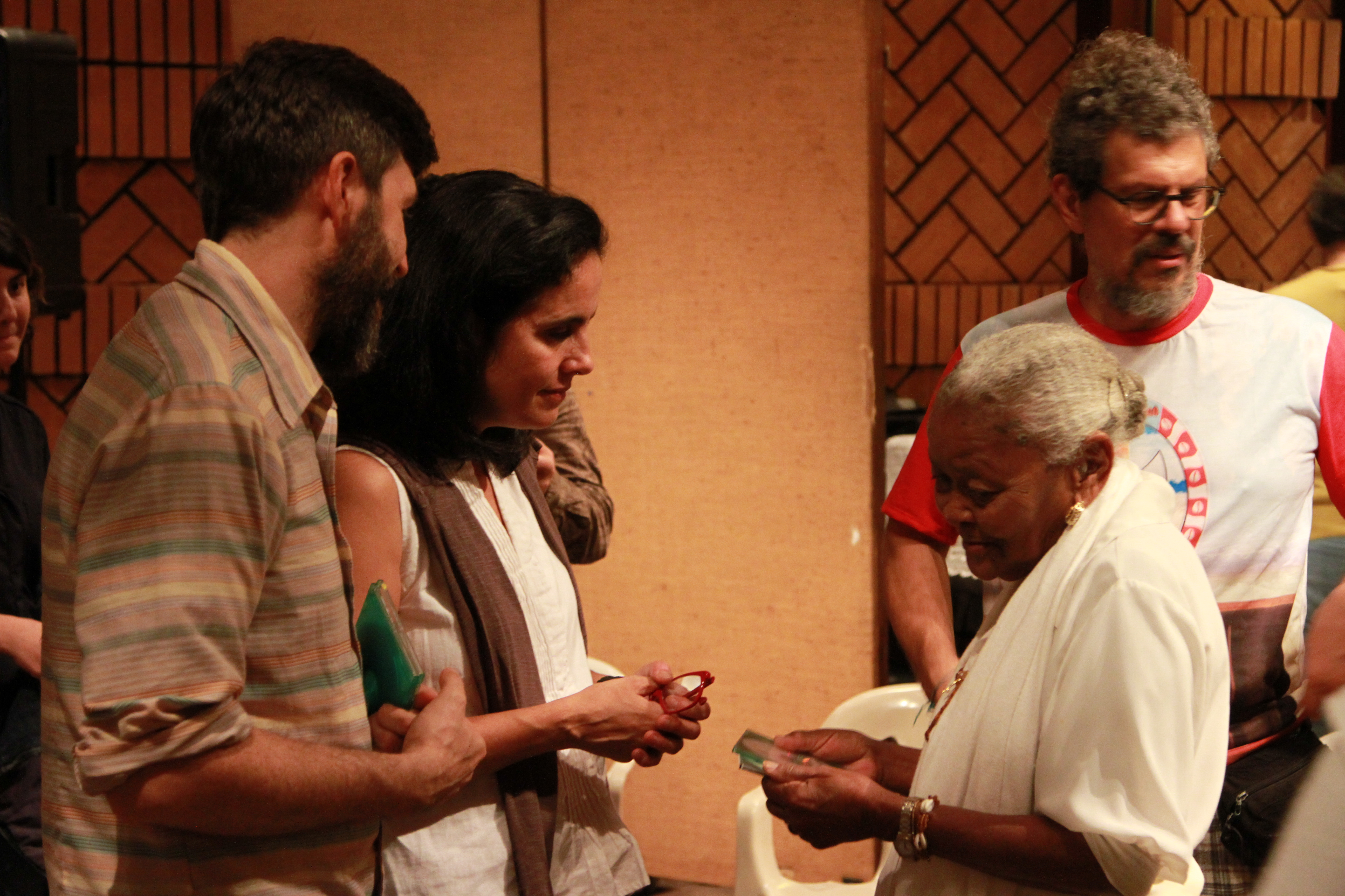 Imagem ilustrando um diálogo entre pessoas , onde há um homem e uma mulher á esquerda e uma senhora a direita  lendo algo em um cartão com um outro homem ao fundo.