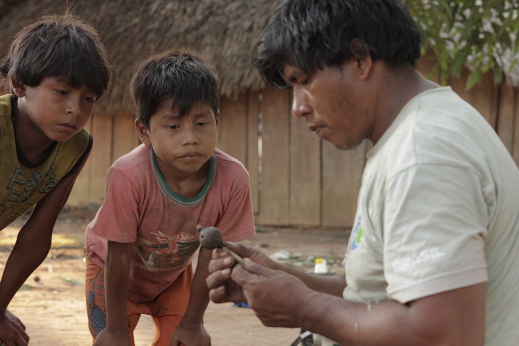 Na comunidade indígena Panará, no Pará, os saberes e fazeres ancestrais também embalam as brincadeiras da região. Ali o pião de tucumã é brinquedo típico, feito por todas as gerações da família. Netos observam atentos os dotes de seus avós para, em seguida, construírem seus próprios piões.