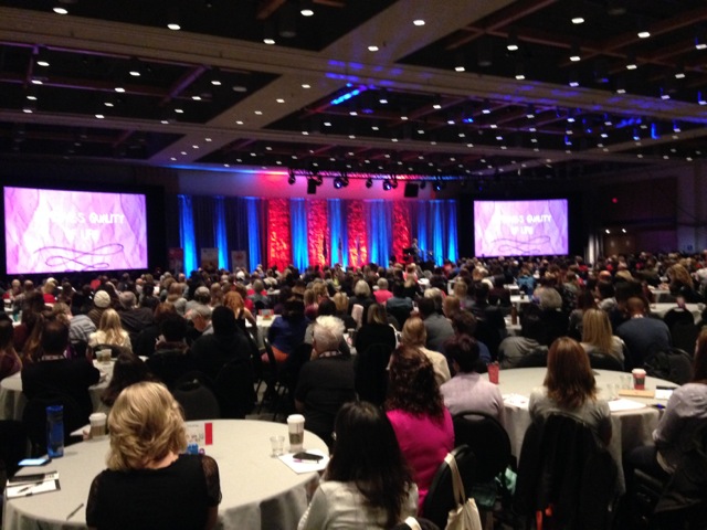 Foto de um grande salão de eventos, várias pessoas estão sentadas em volta de mesas redondas.