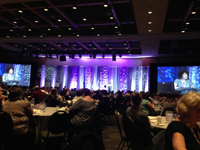 Foto de um grande salão de eventos com palco iluminado em lilás.