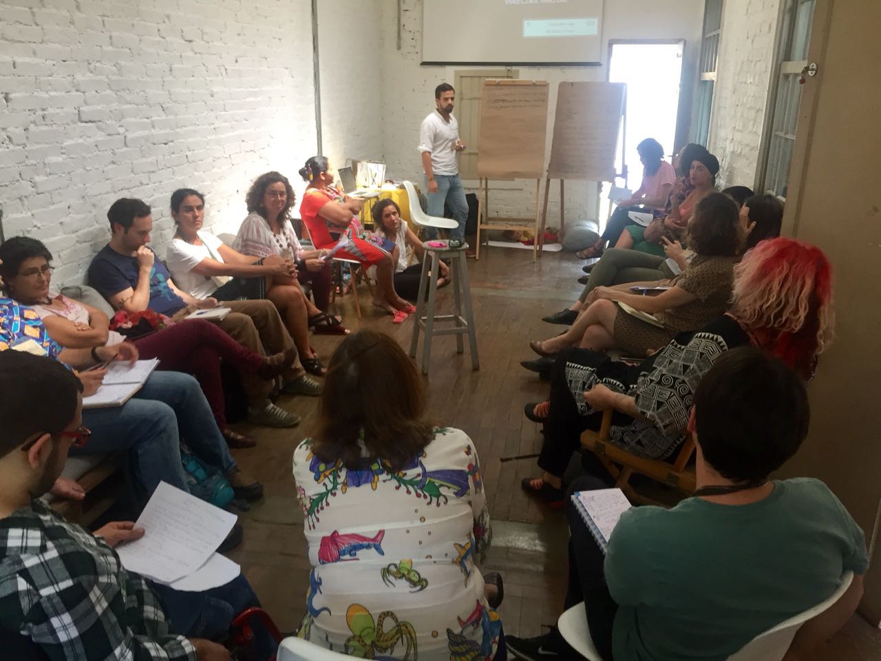 Foto de um homem em frente de dois quadros, fala para uma turma de pessoas sentadas que o observar.