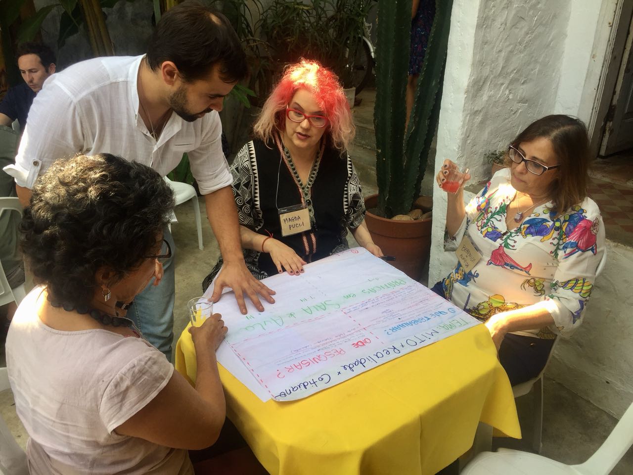 Um grupo de pessoas reunidos em volta de uma mesa, sentadas existem 3 senhoras e um homem em pé.