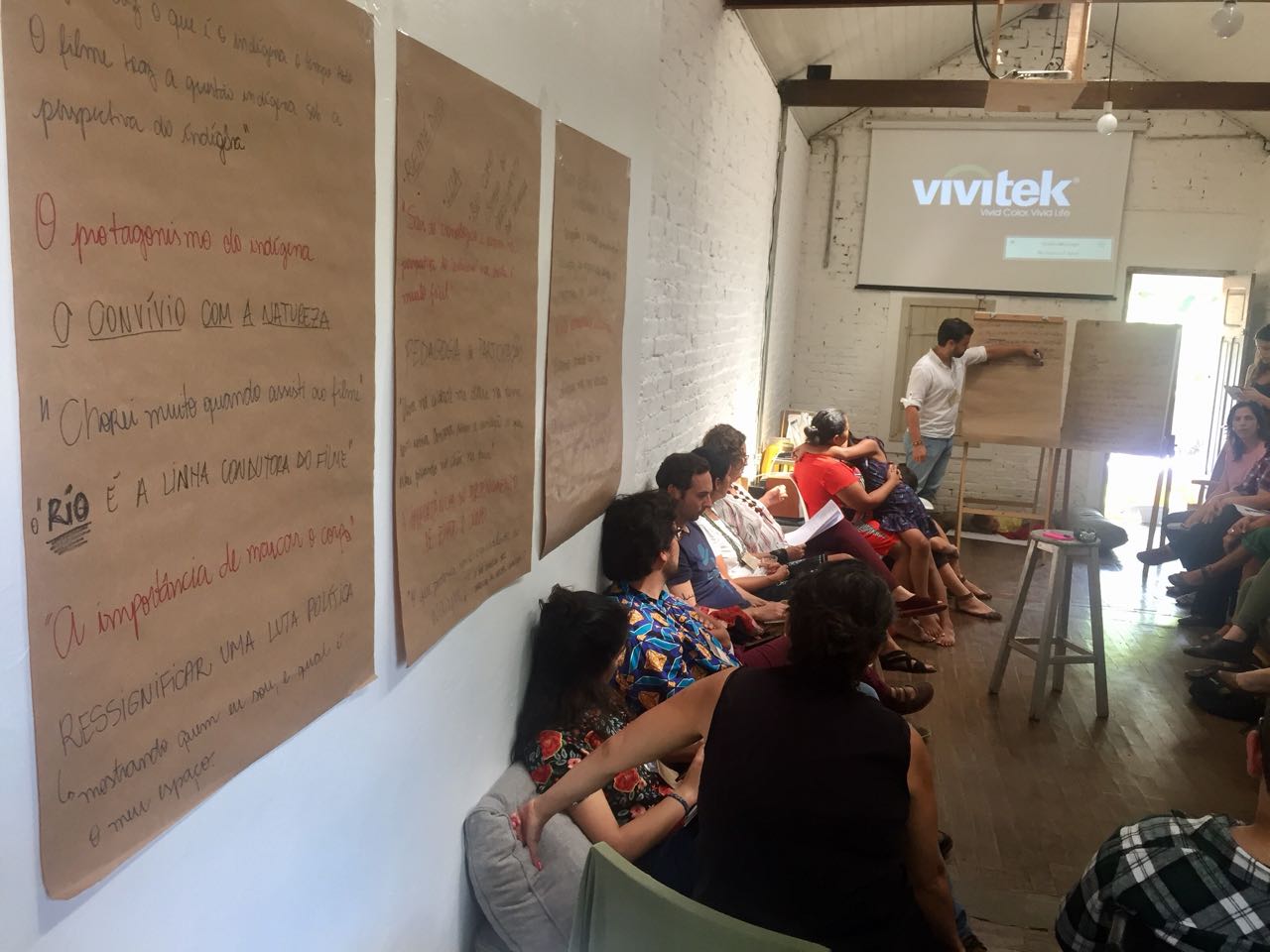 Foto de um home apontando para um quando enquanto uma turma de pessoas o observa.