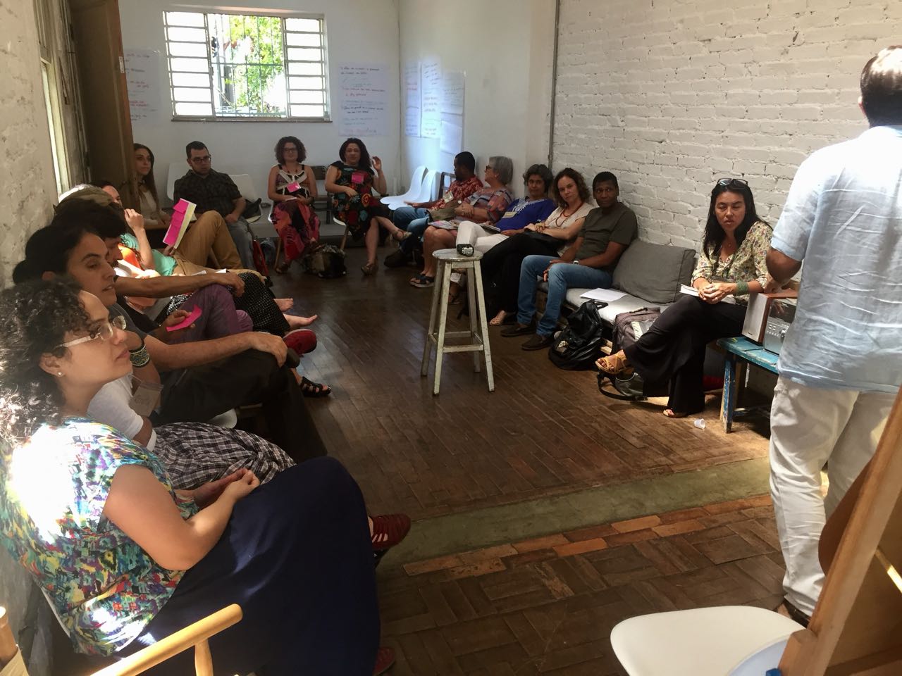 Foto de um home em pé e de costas para a foto, palestra para uma turma sentada em círculo.