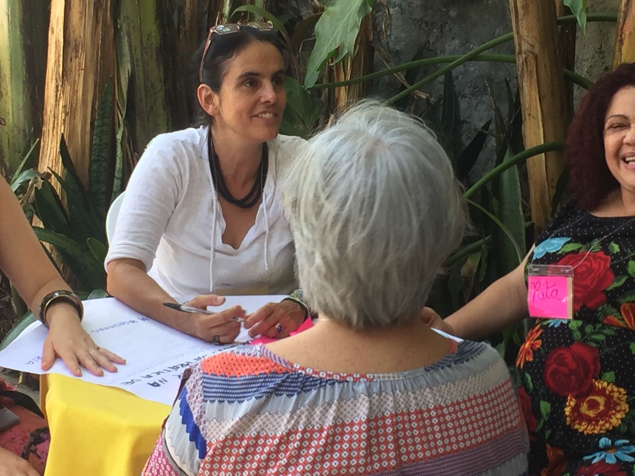 Foto composta por quatro mulheres sentadas em volta de uma mesa, uma senhora de cabelo grisalho está de costa para a foto, a sua direita uma mulher de roupa preta está sorrindo, ao lado direito dela uma mulher de branco sorrindo ao lado direito dela, uma mulher está apoiando seu braço na mesa.