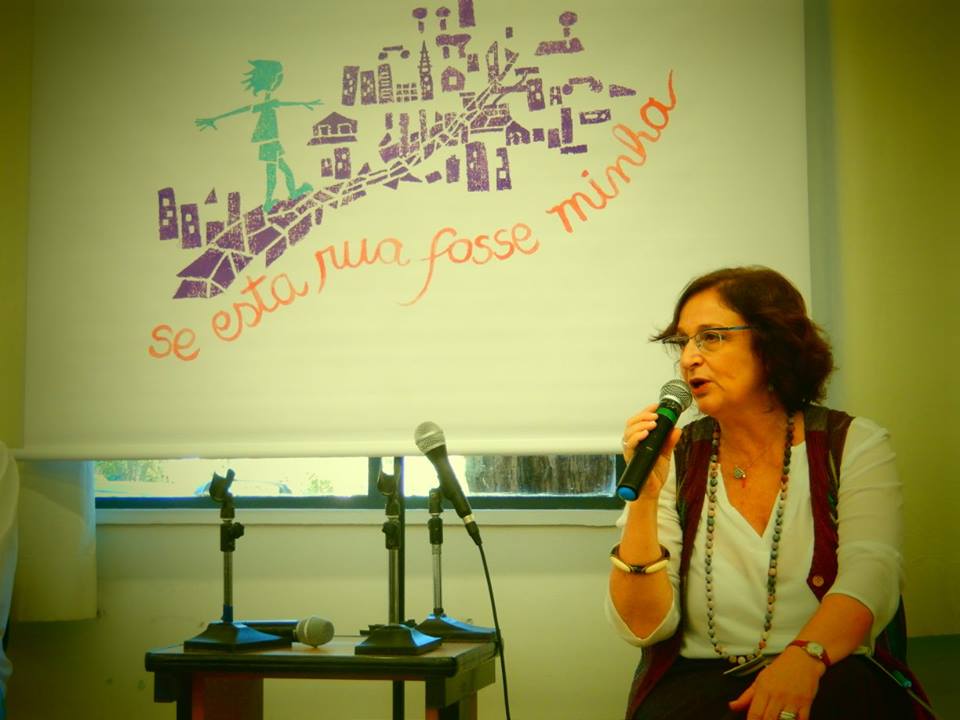 Foto de uma senhora sentada em uma cadeira, fala ao microfone.