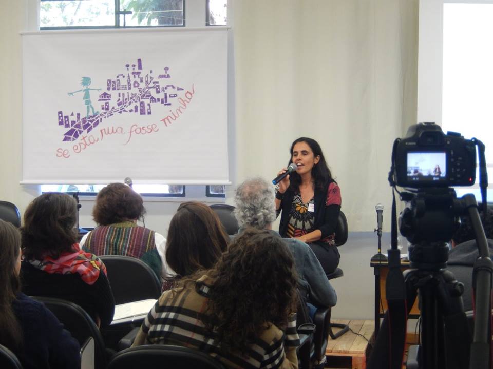 Foto composta por várias pessoas sentadas que observa uma mulher falar ao microfone em cima do palco, uma câmera está filmando.