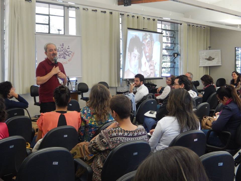 Foto composta por várias pessoas que observam um homem de barba e cabelos grisalho, esse homem está falando ao microfone.