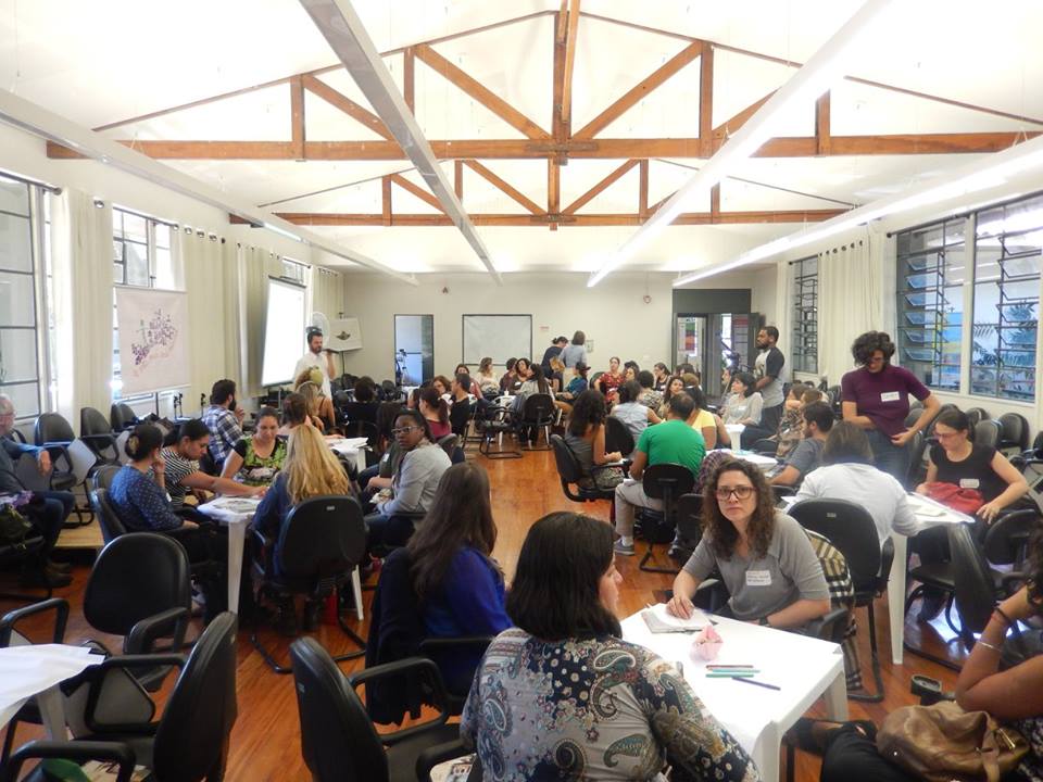 Foto de um salão, onde pessoas estão sentadas em várias mesas.