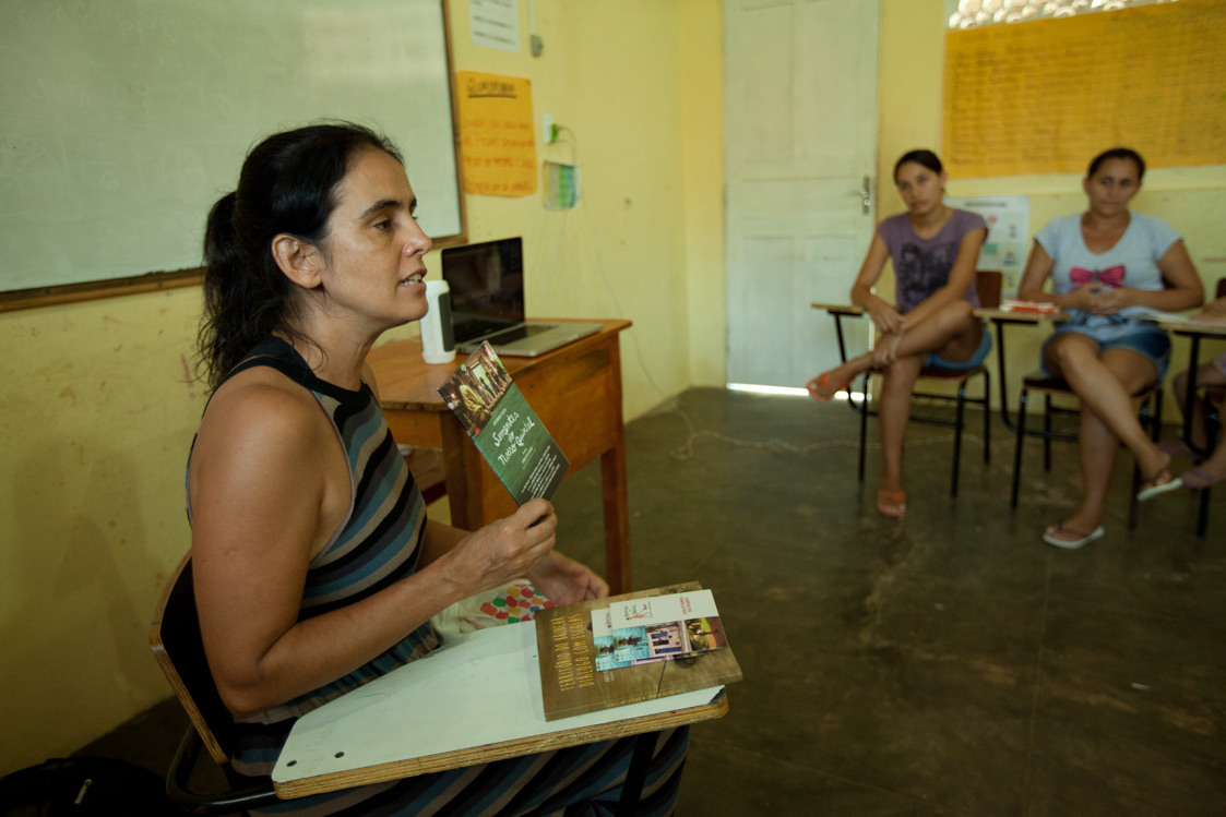 Foto de uma mulher que sentada em uma carteira segura um panfleto com sua mão direita, pessoas a observam.