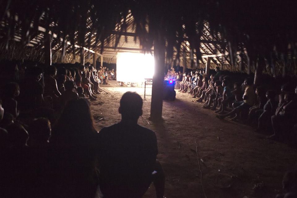 Foto com a silhueta de um homem e de uma mulher, os dois estão de costa para a fotografia e ao redor deles várias crianças sentadas dentro de uma casa de palha, todos observam um telão.