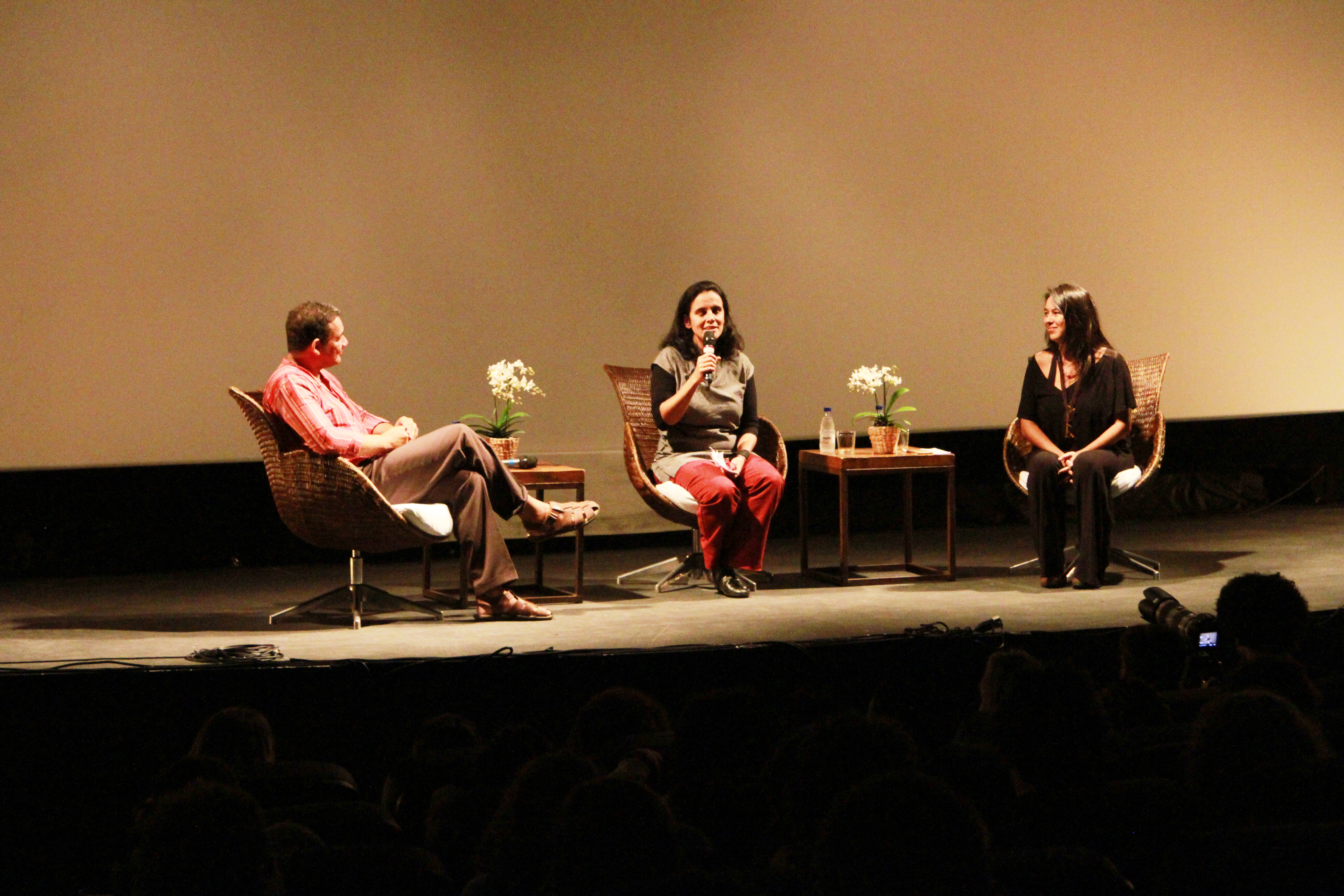 Foto ilustrando uma palestra , onde em um palco há uma mulher ao centro com um microfone á mão  , á esquerda á um homem e a direita á outra mulher.