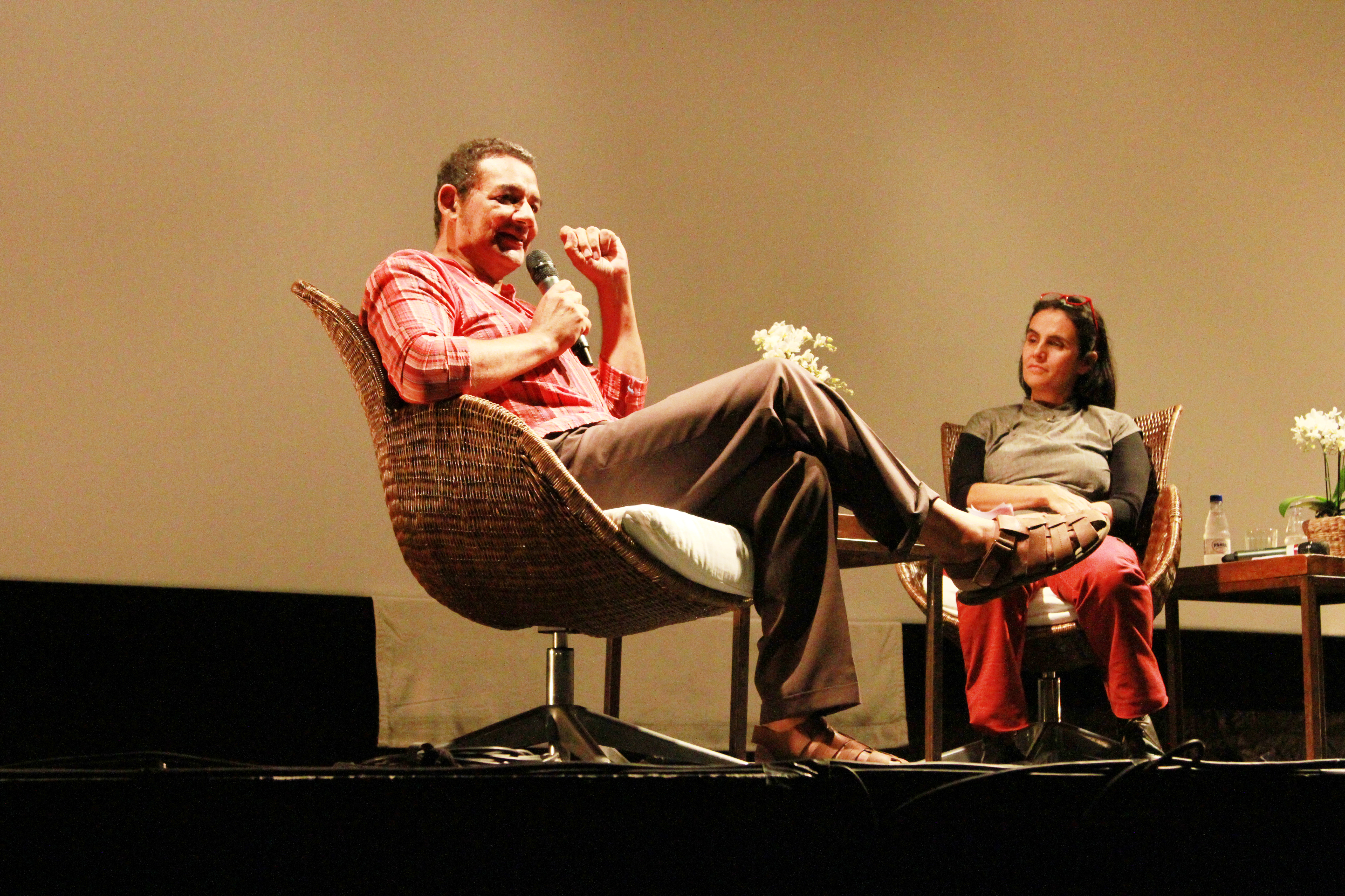 Foto onde á ao centro um palestrante homem, sentado com um microfone á mão e uma mulher á direita em um palco.