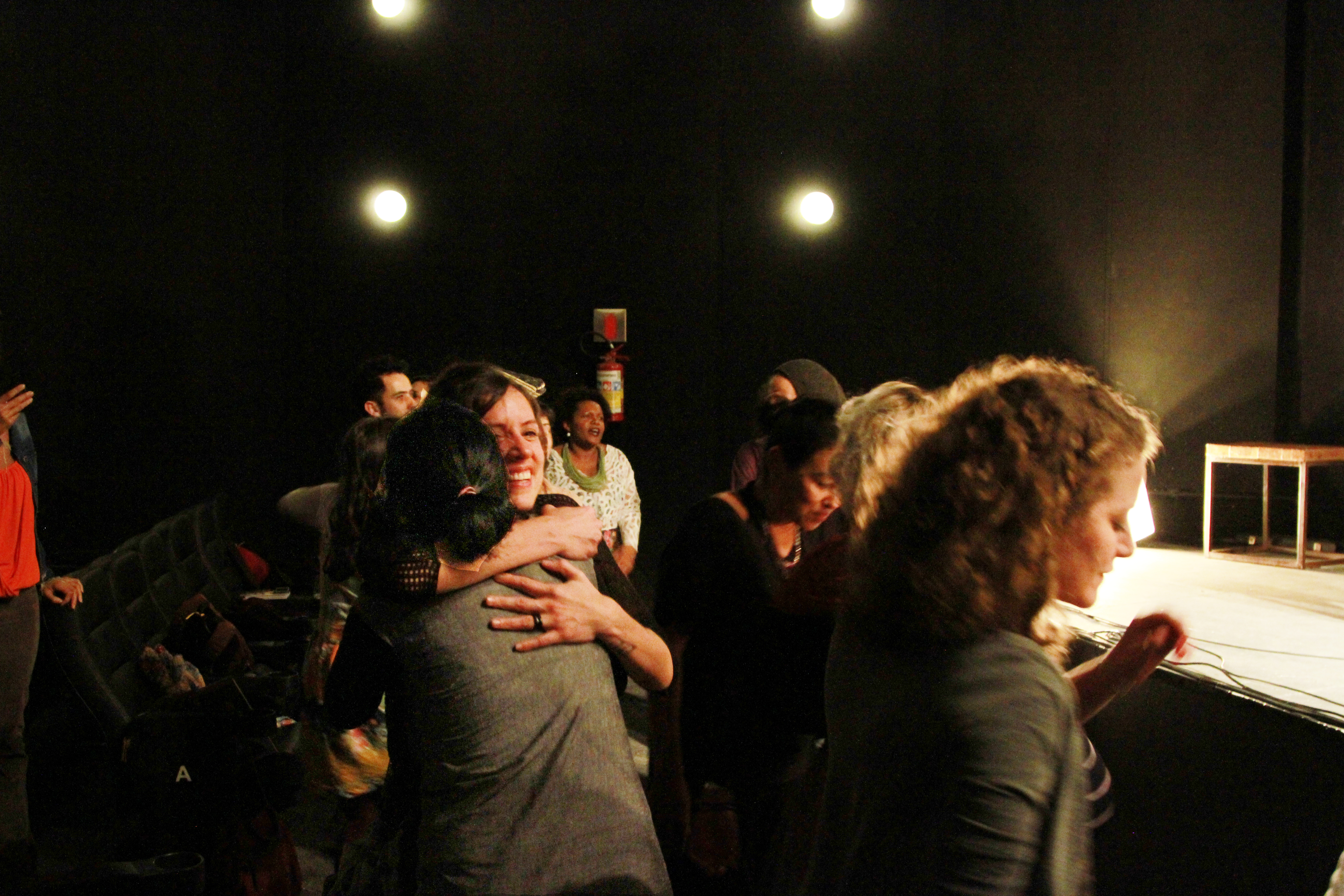 Foto mostrando inúmeras pessoas se interagindo , onde há abraços e comprimentos ao centro da imagem entre duas mulheres.