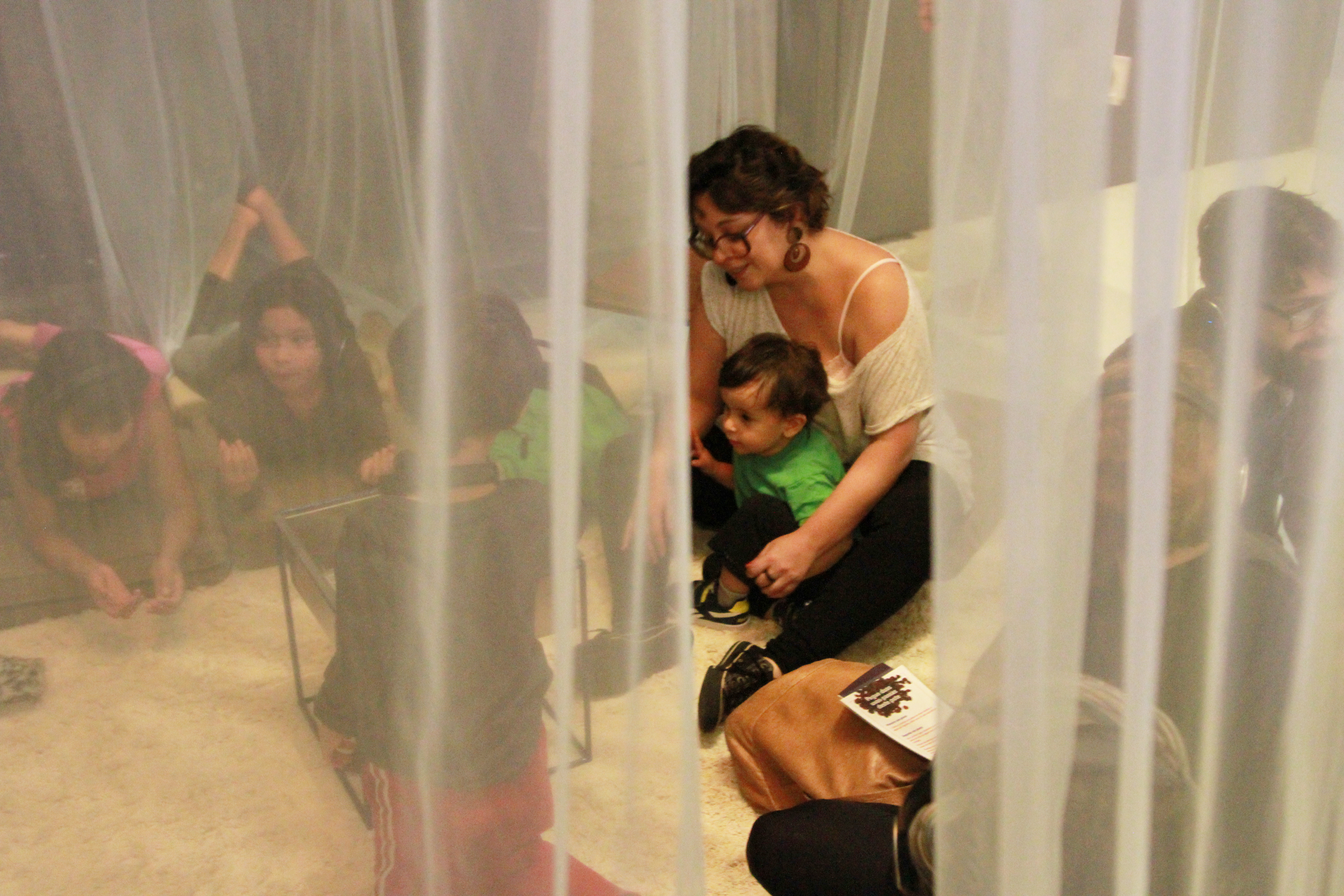 Foto com quatro crianças se interagindo , onde ao centro á uma mulher com um menino sentado em seu colo.