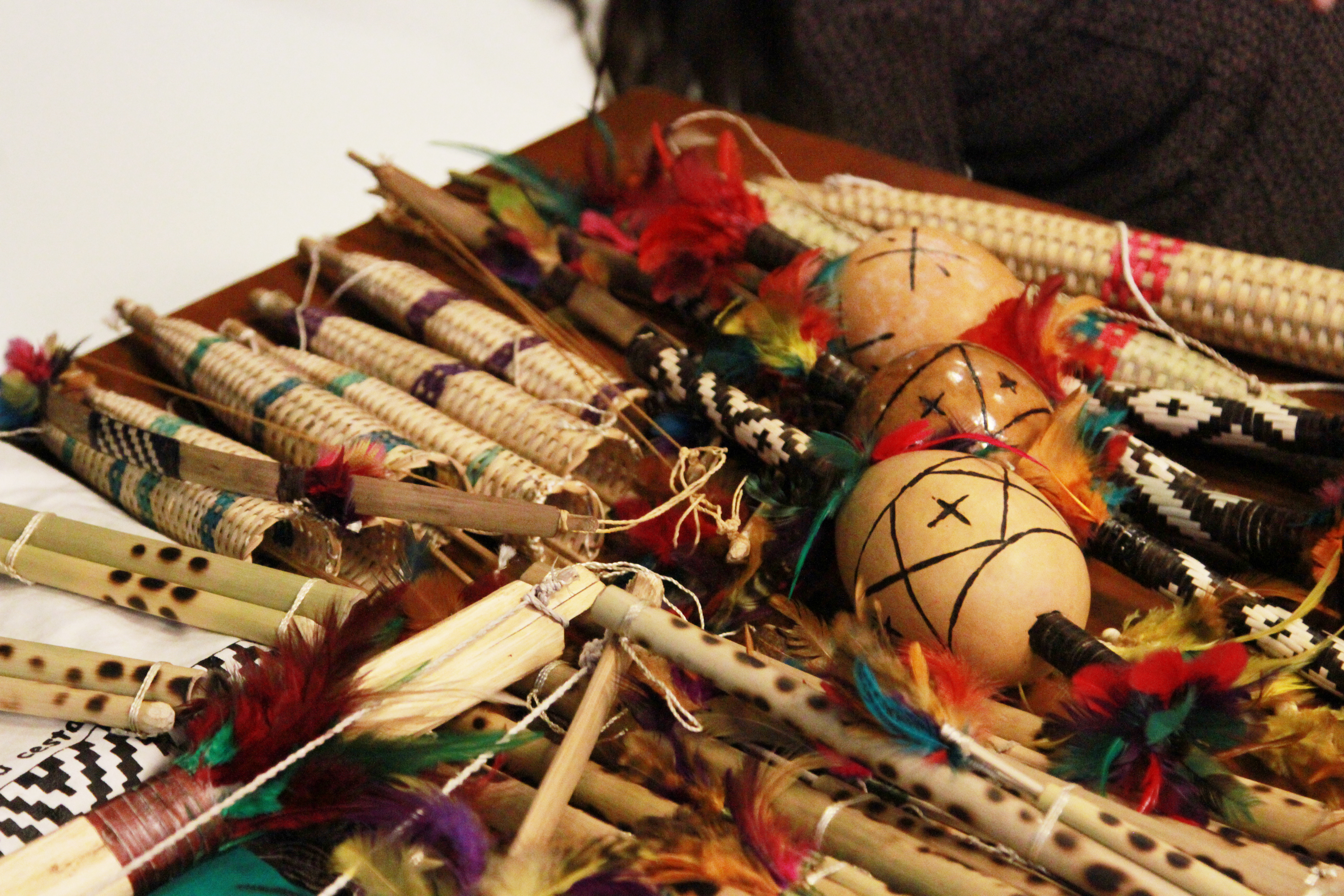 Foto de uma mesa com inúmeros artefatos indígenas mais próximos.
