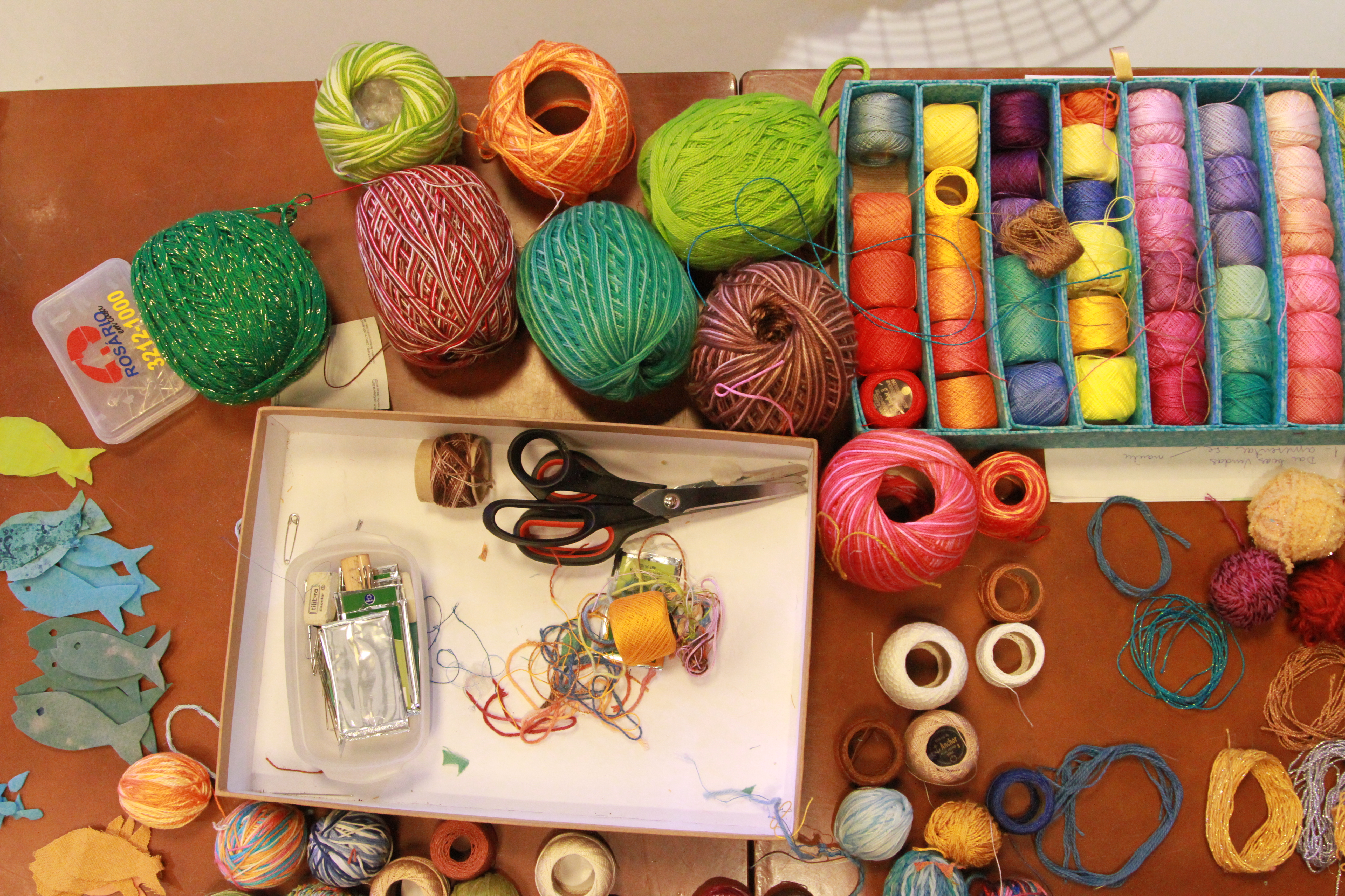 Foto de uma mesa com inúmeras linhas de costura de diversas cores , junto com algumas tesouras e agulhas