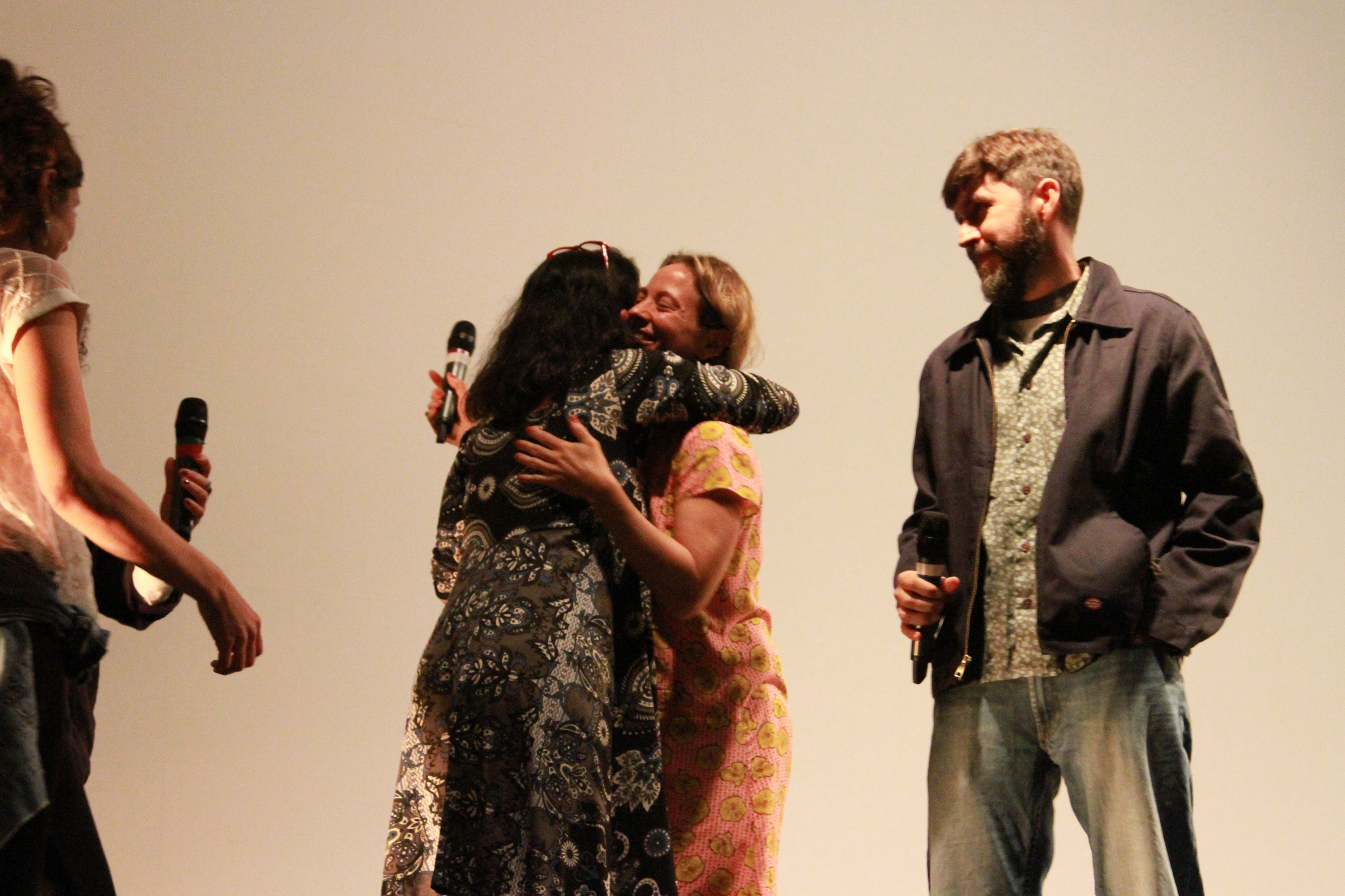 Foto com quatro pessoas , onde ao centro á duas mulheres se abraçando.
