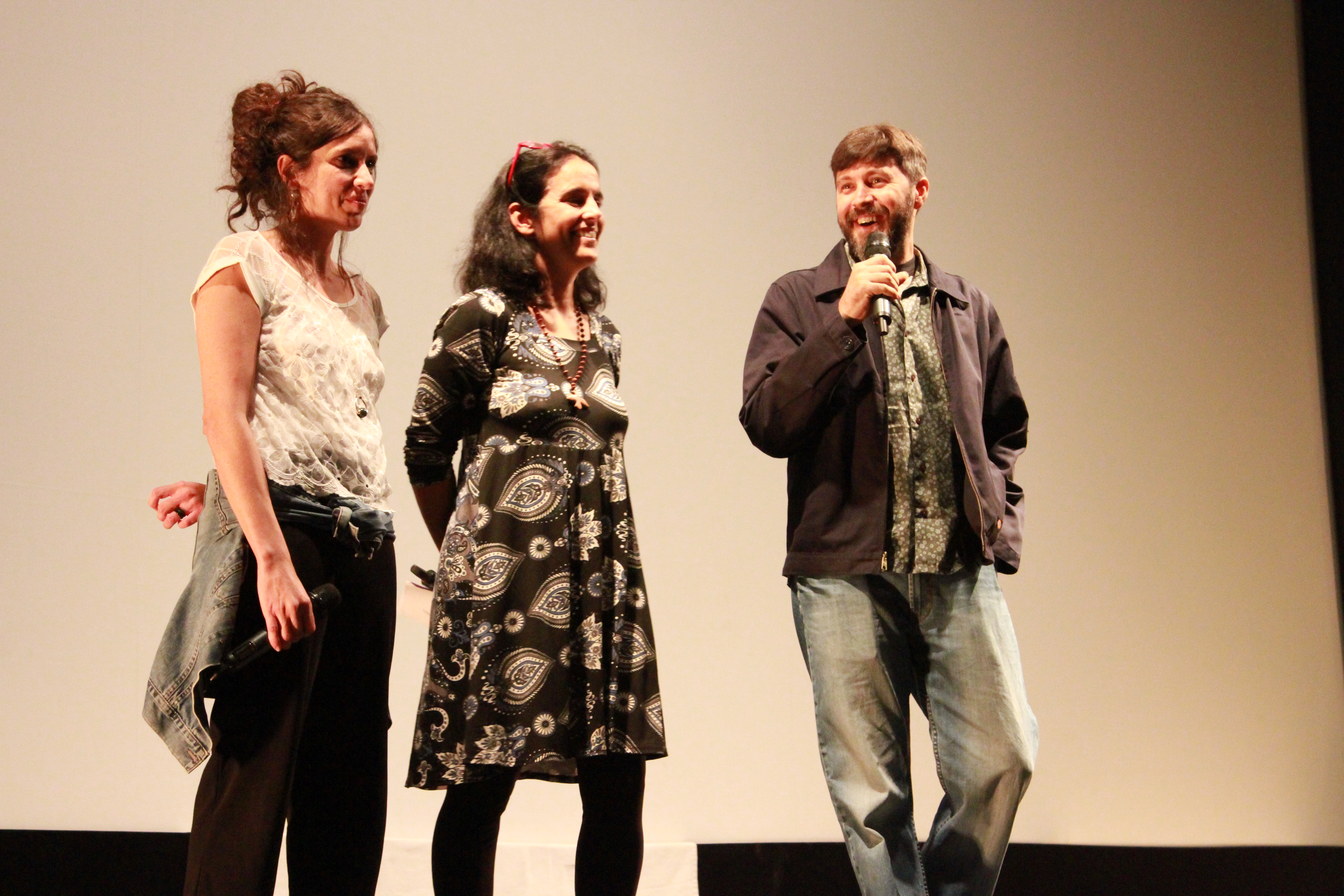 Foto composta de três pessoas , duas mulheres e um homem onde á direita da foto o homem está com um microfone á mão.