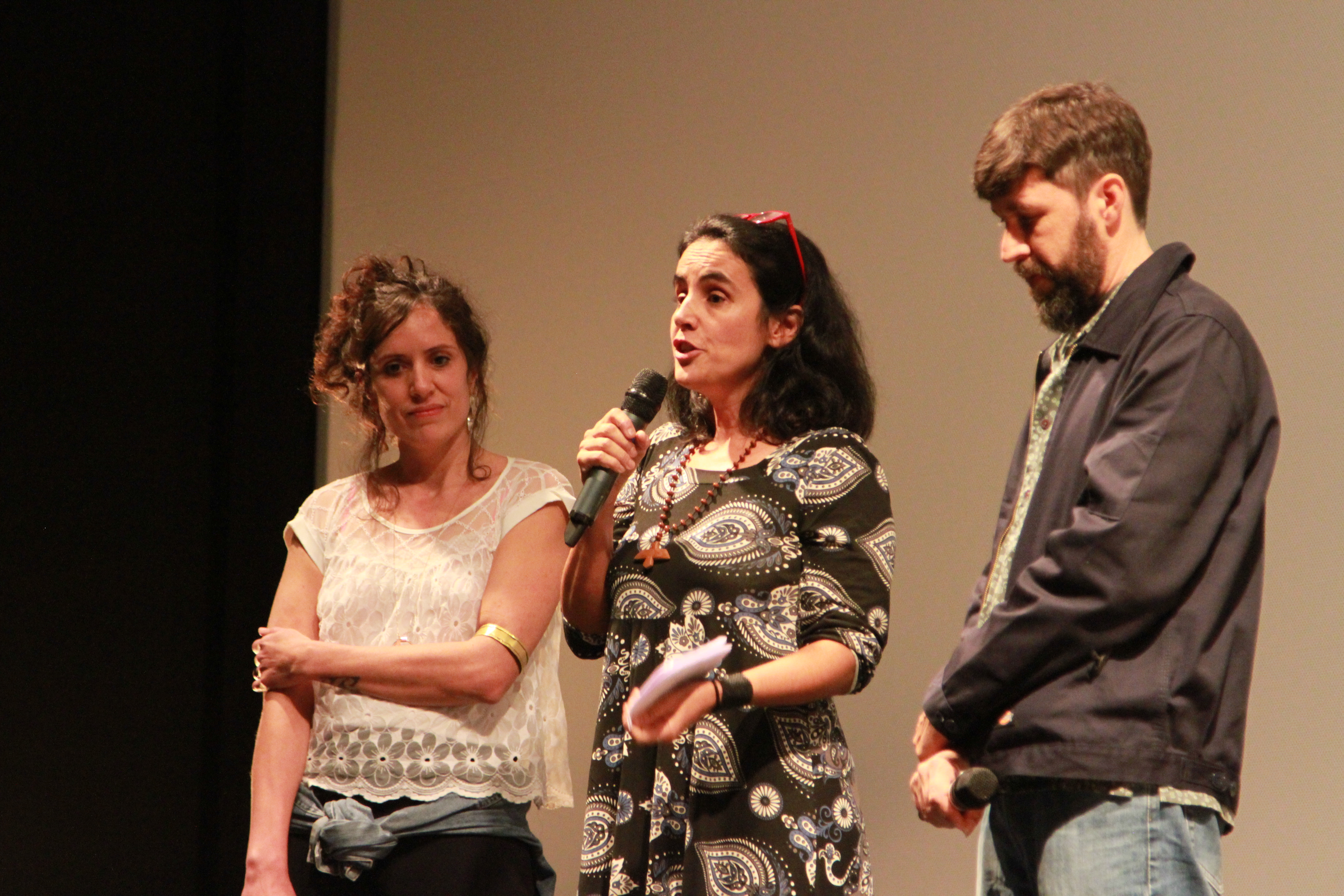 Foto composta de três pessoas , duas mulheres e um homem onde á mulher no centro da foto está com um microfone á mão.