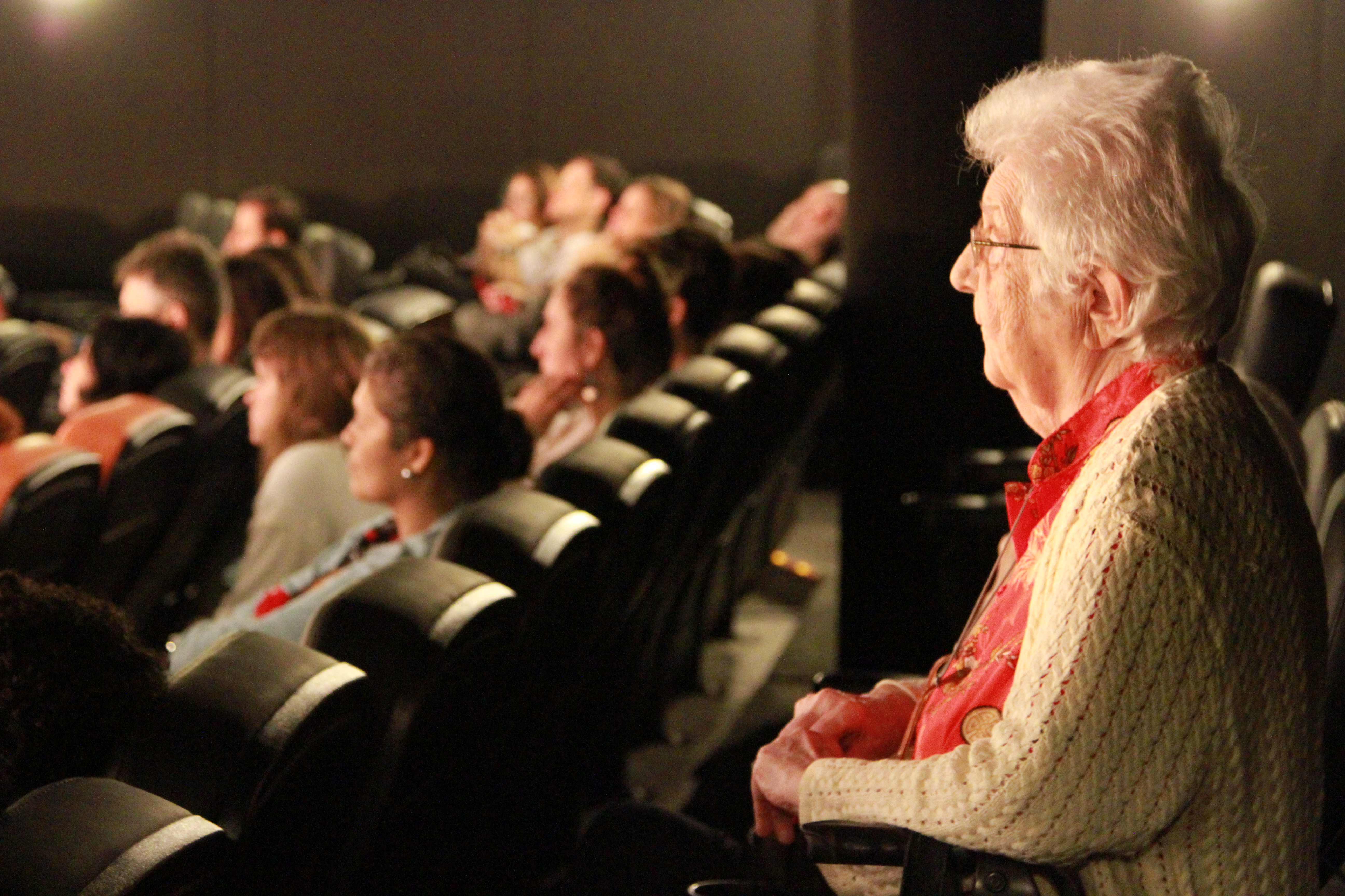Foto de uma sala de cinema, onde á esquerda á uma senhora em pé observando a sessão.