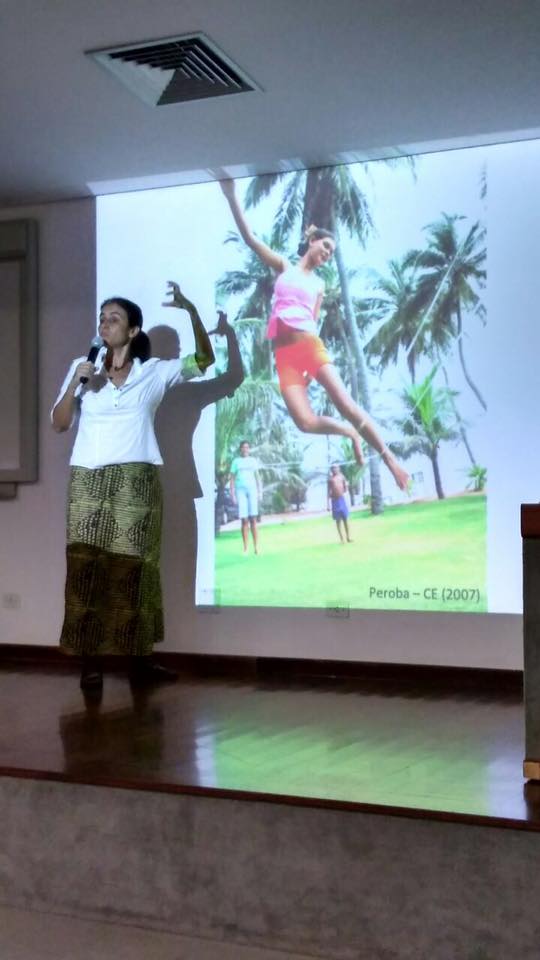 Foto de uma mulher em um palco falando ao microfone que segura com a sua mão direita e gesticulando com a sua mão esquerda, de costa para uma foto retroprojetora de crianças brincando.