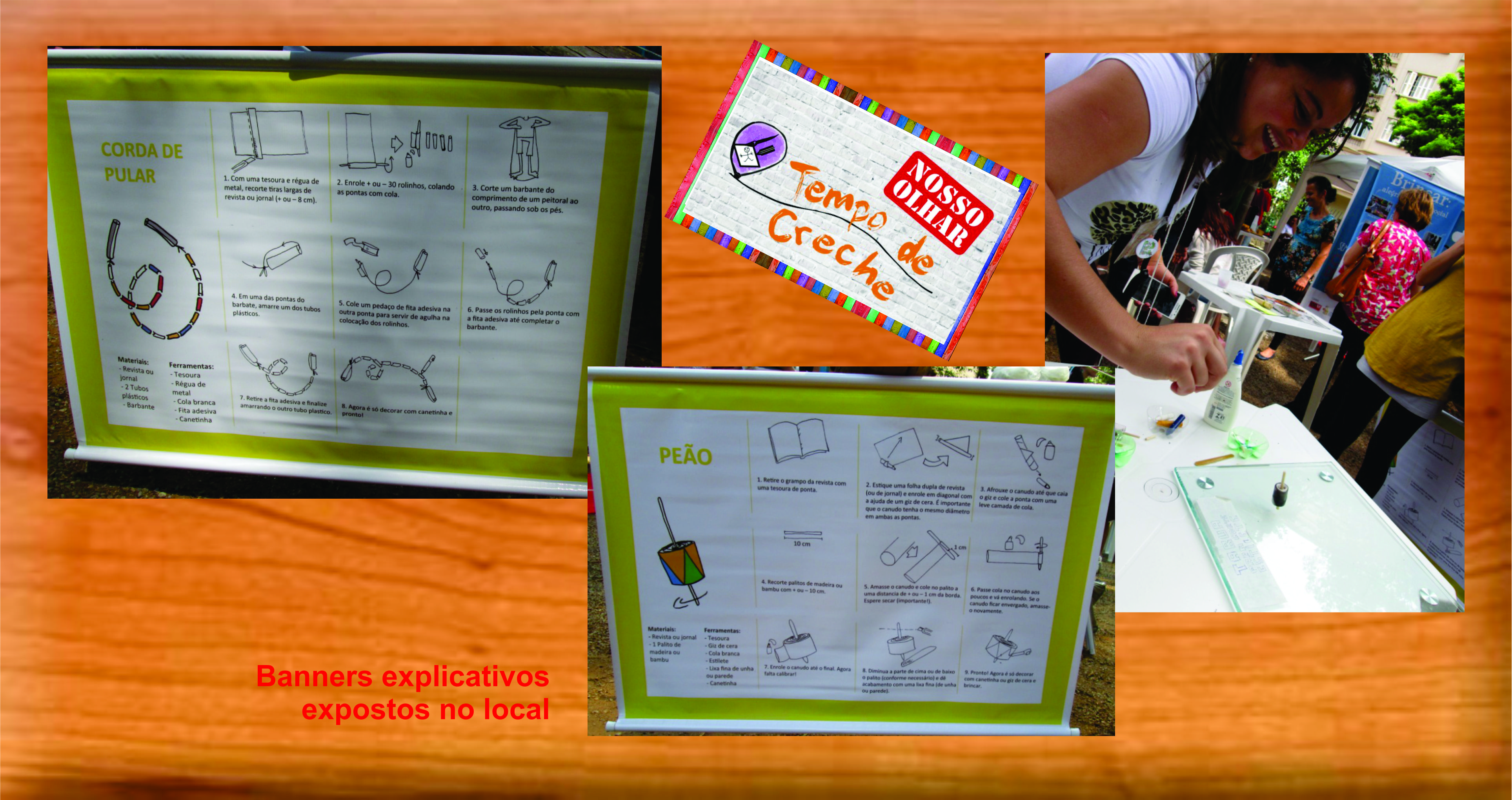 *Dica: veja o post Atividade: a arte da arquitetura para crianças, com uma atividade diferente Na oficina de confecção de brinquedos com revista ou jornal (foram duas: a de corda e a do peão), como podemos ver identificadas nas fotos abaixo, os banners expostos no local resumem as explicações necessárias o que facilita sua a compreensão. Assim, os participantes ficam mais autônomos (já que todas as informações estão visíveis) e o educador está mais livre para atender as solicitações. Vale notar o quanto é importante ter todo o material à mão e preparado antes do início da oficina. Pode ser prevista, por exemplo, uma atividade em etapas, em dias diferentes, de acordo com as características dos grupos.