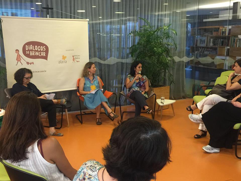 Foto de três mulheres dando palestra em uma roda de pessoas a mulher ao fundo da foto fala ao microfone enquanto a sua direita uma mulher vestida de azul a observa.