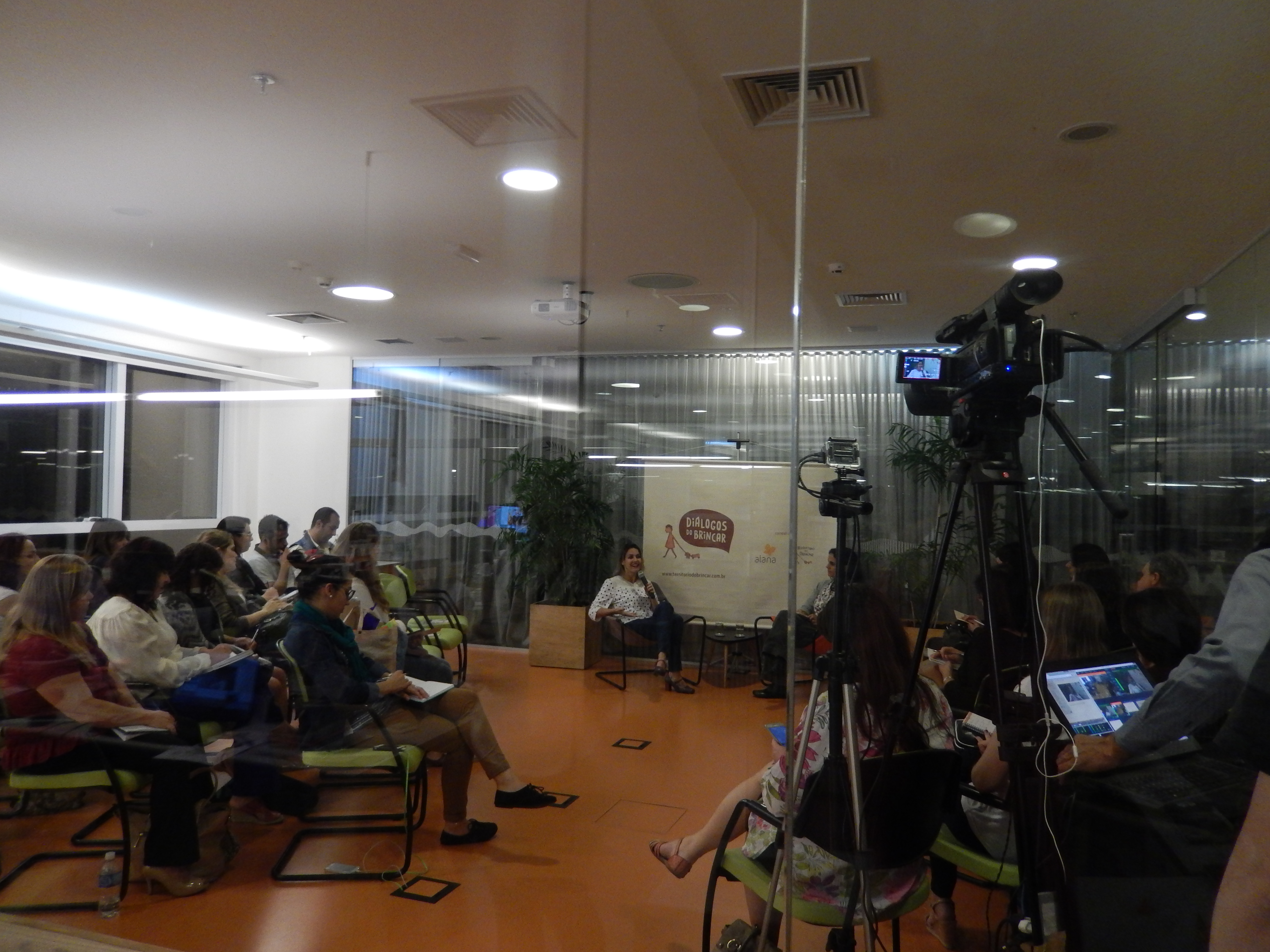 Foto composta por várias pessoas sentadas observando uma mulher falando ao microfone, uma câmera está filmando.