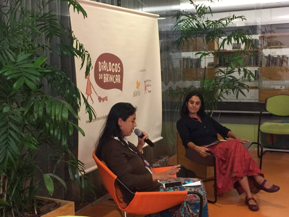 Foto composta por duas mulheres, uma fala ao microfone olhando para baixo, enquanto a sua esquerda outra mulher a observa.